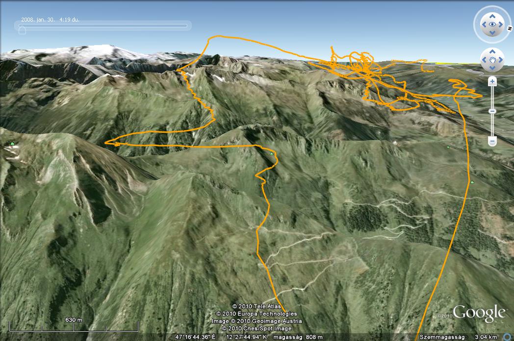 szitu: szembeszeles siklás vissza Wildkogel felé nyugatnak (az első képen a bal oldali sárga vonal). A dilemma: nem vagyok elég magasan ahhoz, hogy a következő gerincre (első képen jobbra előrébb) a napsütötte luv oldalra érjek, csak nagy kerülő (és értékes méterek) árán. A csavar: besiklás a felhő alatt luv oldalon a hegyig, majd előre a DNY-nak néző hegyoldal mentén (ami az isten háta mögött volt, és kb. még a völgy se látszódott innen). Itt volt a nap második bika termike átlag +6 felett, ami a felhő alól kisiklás közben is folytatódott. (Majd a felhő szélén fékek a beülő alá az ernyő beomlásának megfogása végett)