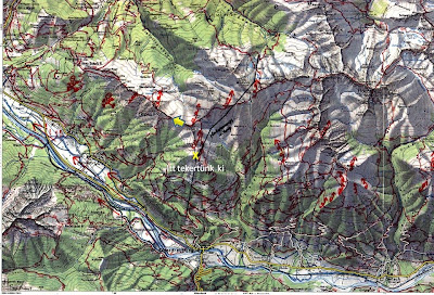 Elküzdöttük magunkat a lienz felé vezető lefutó gerinc széléig (a tájékozódási pont az itt futó nagyfeszültségű vezeték). Termikek gyengék és töredezettek, kumó kevés, valami pamacs az Anna Shutz Haus környékén (messze). Itt már nem véd semmit a Kreuzeck gruppe, befúj a kb 15-20 kmh északi szél, sőt, látszik a főn fal tőlünk jobbra az Alpok fő gerincén. Itt a helyi térkép, sárga nyíllal jelölve, hogy kb hol készült a lenti fotó és merre néz. Az egyik para a térképen is látszik: a völgy Oberdrauburgnál beszűkül, a völgyszél begyorsul és a déli lefutó gerincek mögött lee oldal alakul ki, ezt jelzik a kis halálfejek. (BTW ezért nem is javasolt erre jönni Lienz felöl visszafele, mert legtöbbször besüllyed ide az ember.)