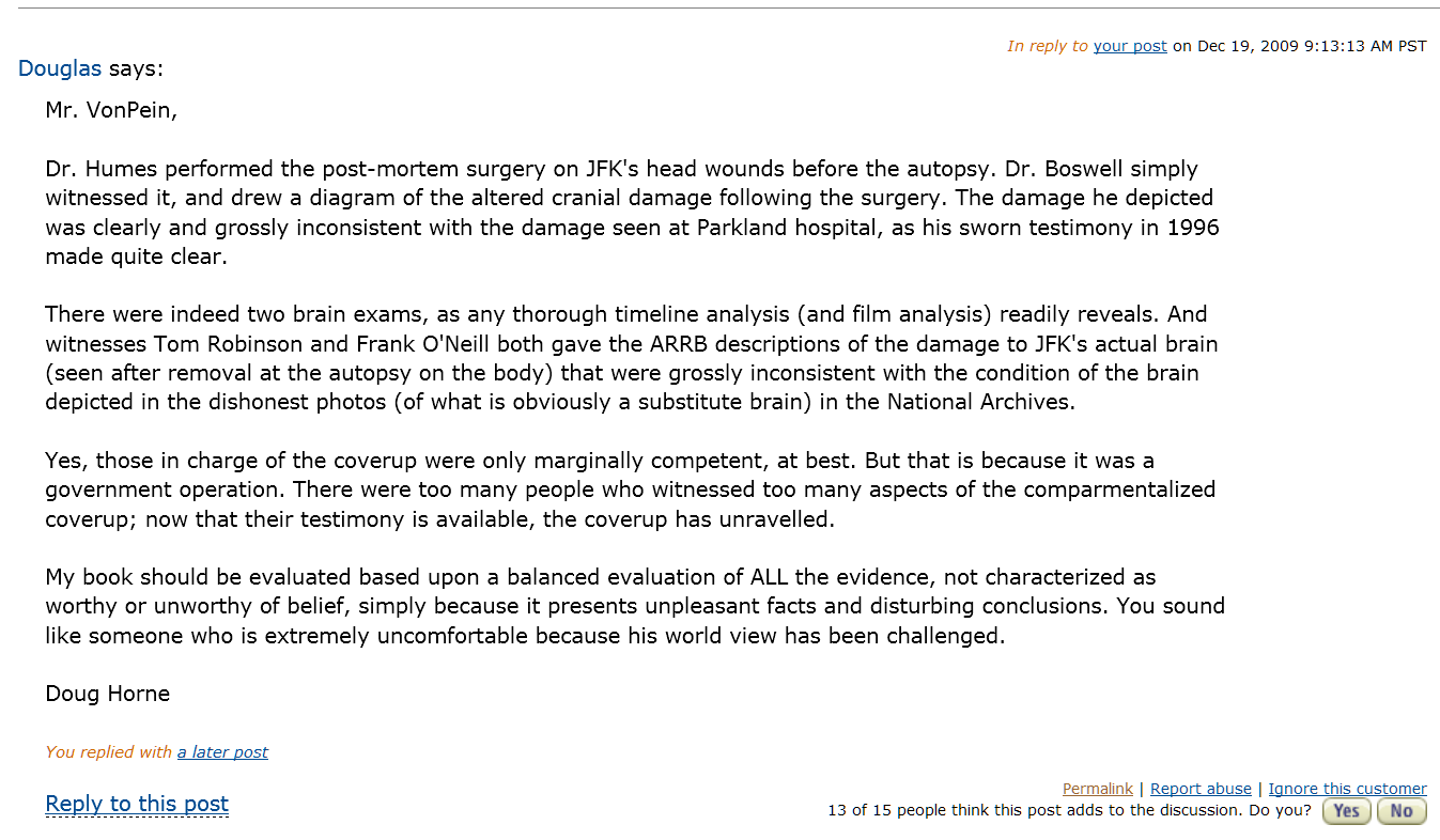 > > > Yeah, Jason, I was laughing at "Laz" too. Horne is really a great guy to follow and trust in the JFK case, isn't he? The same guy who said all this crap to me in 2009: