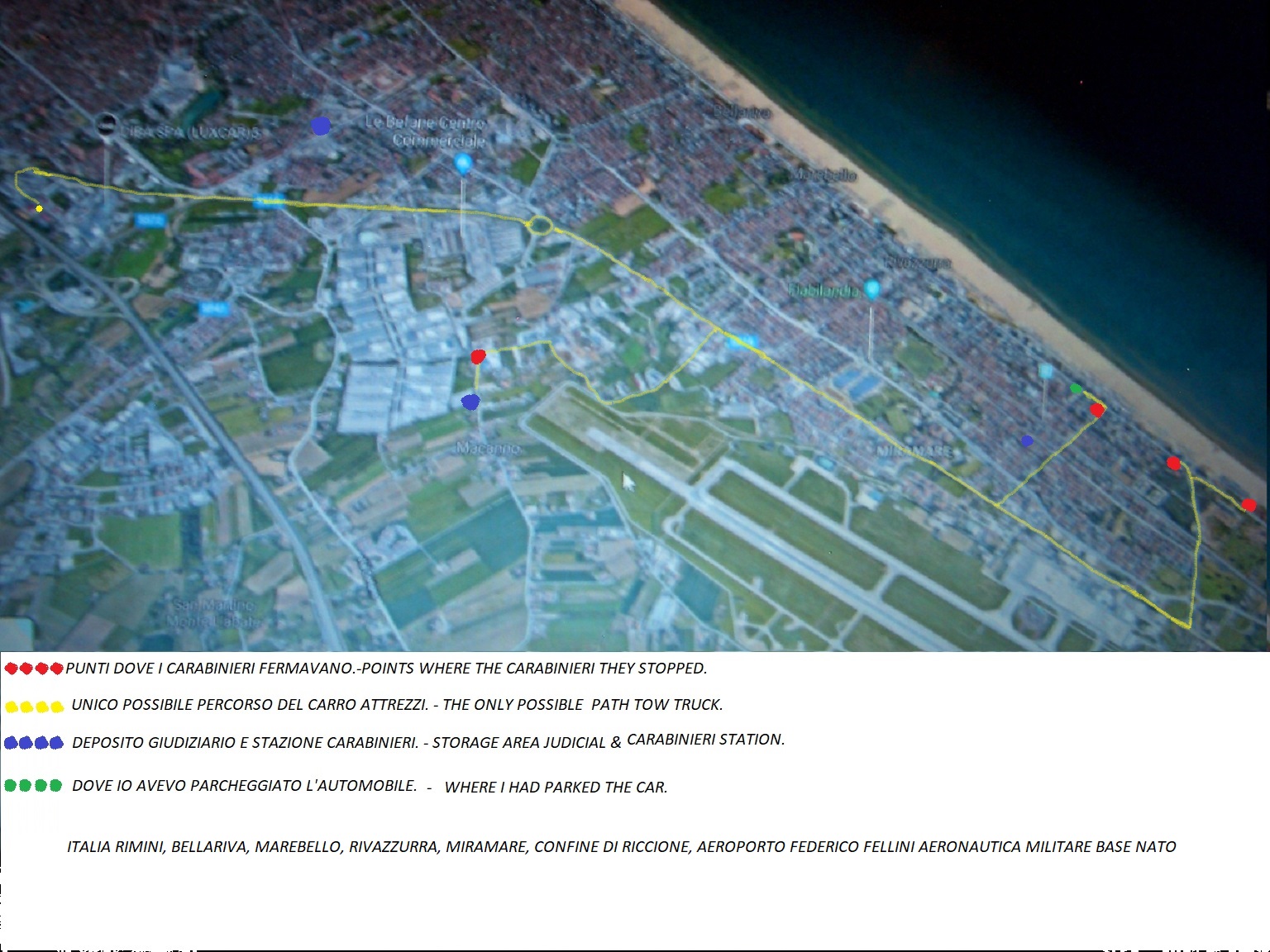 Questa è tutta la zona delle #irregolarità - #denunciate, io ho solo queste informazioni e non escludo altri punti dove avveniva la stessa procedura illecita, credo che non cambi molto il tragitto verso il deposito #giudiziario, la strada evidenziata con il giallo è la #SS3 - #Flaminia che è anche #SS16 - #Adriatica diramandosi in località #Bellariva, essa è la #strada - #statale più #videoregistrata dell’ #Emilia - #Romagna perché vi è l’ - #Aeroporto - #Internazionale - #Militare#Base - #NATO - #Aeronautica in più la diramazione per lo #Stato – #Repubblica - #San - #Marino - #SanMarino.