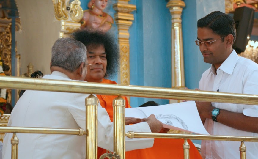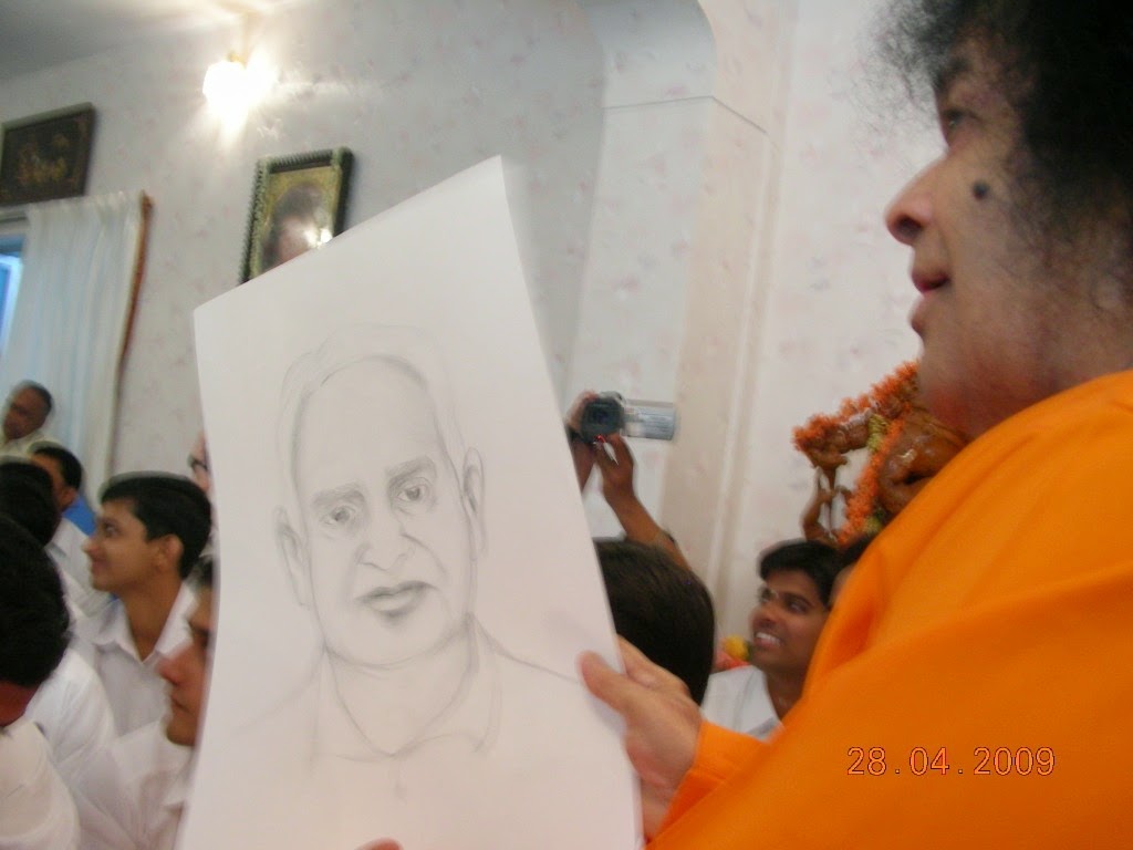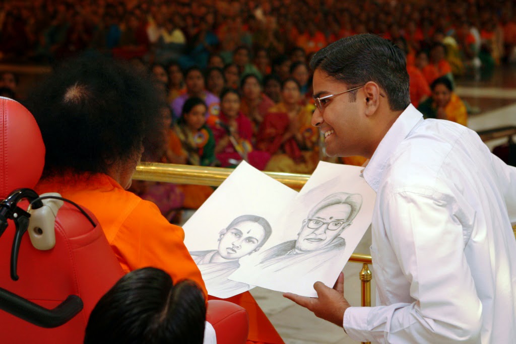 Vijay understood and swung into action. The next day, as Swami passed by him during darshan, he popped up with two sketches. He had added the sketch of the former Vice Chancellor, Sri.S.V.Giri, who was walking on the other side of Swami. Now Swami accepted both! He presented it to the respective subjects and said,