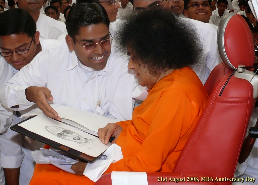 But even that reaction was joyous for Vijay. It did not matter to him that Swami criticised his sketch. He just enjoyed the interactions - praise and criticism were treated equally. That was how, even without his knowledge, Swami conferred on him the gift of equanimity. This equanimity coupled with tremendous persistence gave Vijay the strength to create sketches of all the faculty members in the MBA department of the Institute. He offered them to Swami on 21st August, the ‘MBA formation Day’ or ‘MBA Day’. Swami saw through dozens of sketches and blessed them all. He said,