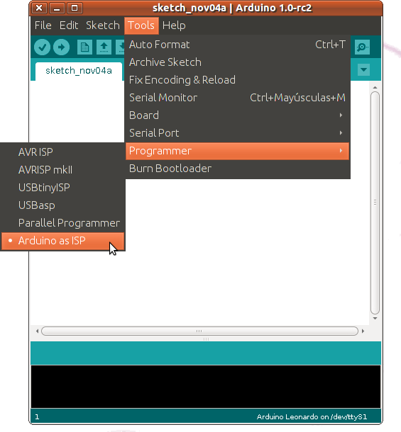 7 Y por último seleccionamos Tools/Burn Bootloader, para cargar el bootloader de Leonardo en nuestro Paperduino.
