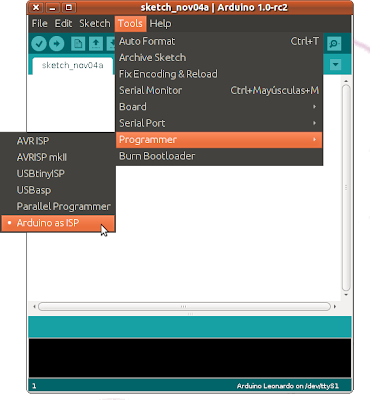 6 Le indicamos que vamos a programarlo utilizando un Arduino como programador: Tools/Programmer/Arduino as ISP: