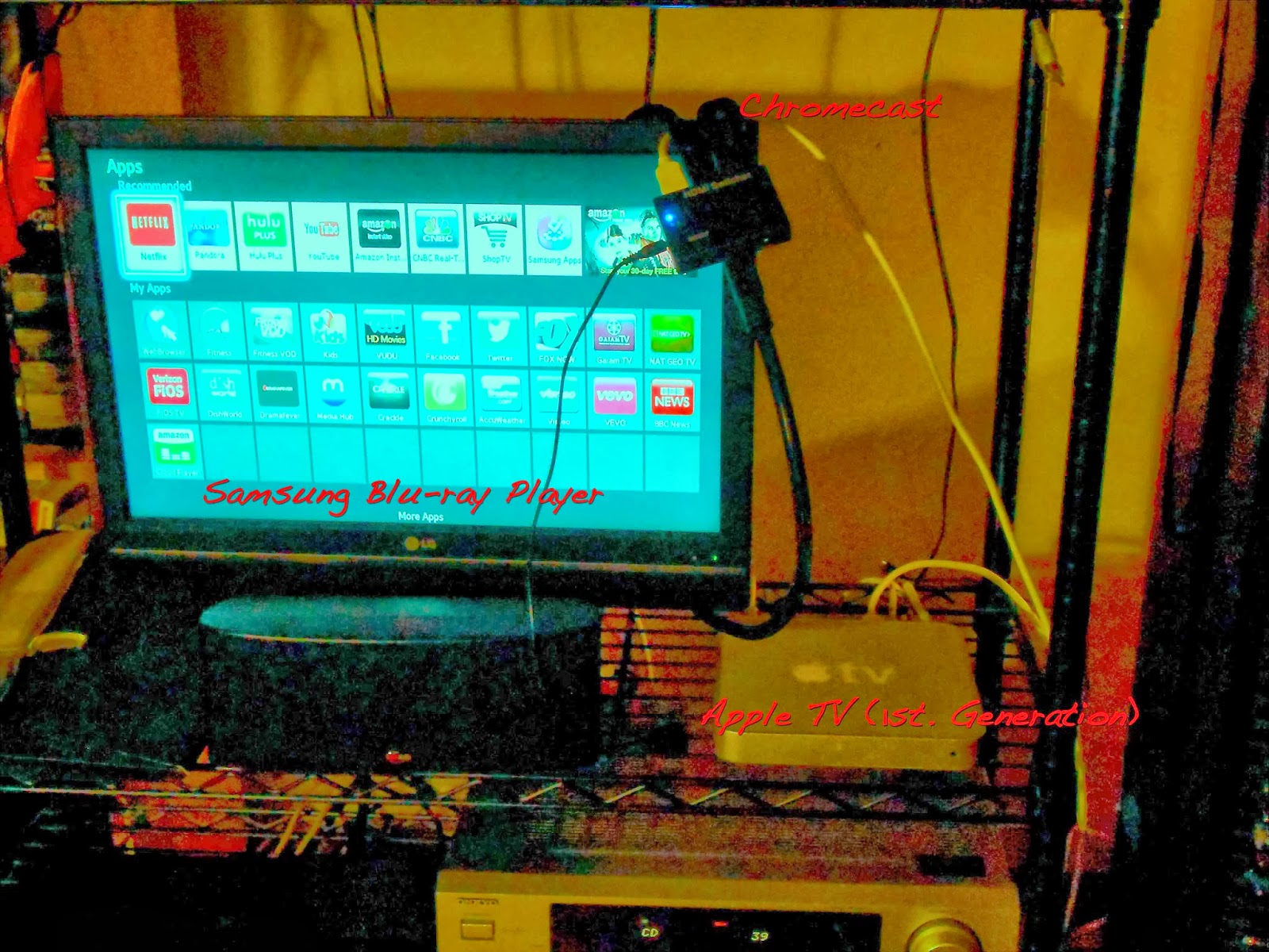 I still like my old AppleTV for streaming Internet radio, listening to my music, and sharing my photos. It's weird that neither the Chromecast or the Samsung have radio apps other than Pandora. It's also nice to have in case there's something exclusive to iTunes.