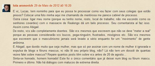 De resto, vcs são completamente doentes. São vcs mesmos que escrevem que não se deve "meter a real" porque as pessoas considerarão vcs loucos, pega-ninguém, frustrados, misóginos etc. São vcs mesmos que escrevem que o masculinismo jamais será levado a sério enquanto for um "movimento" de gente anônima. (Comentário na postagem "As mentiras da feminista Lola" do blogue Marxismo Cultural, de 22.05.12, em http://omarxismocultural.blogspot.com.br/2012/05/as-mentiras-da-feminista-lola.html)