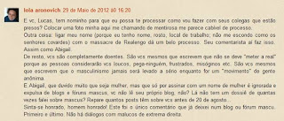 Papagaios! De onde saiu este idiota?! Ou melhor: por que estou citando este idiota (principalmente se eu prometi não abusar da paciência dos leitores)? Vejam o caso deste outro comentarista em "Homens se passando, e mulheres se passando por inocentes" (15.10.11, em http://escrevalolaescreva.blogspot.com/2011/10/homens-se-passando-e-mulheres-se.html) e talvez eu não precise dizer mais nada: