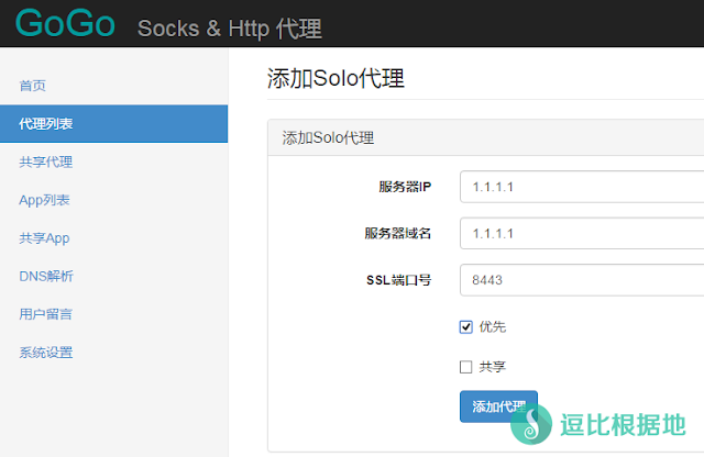 然后点击侧栏 代理列表,然后点击右上角的 添加Solo代理 按钮,然后输入你的VPS IP到 服务器IP、服务器域名的输入框中,并勾选 优先,然后点击 添加代理。