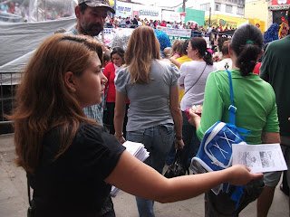 Ana Paula (Estudante e integrante do Cerimonial PJU Garanhuns) entregando os informativos em frente ao Palco Cultura Popular.