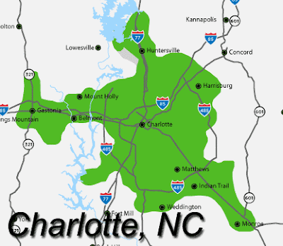 Charlotte service extends to 834,000 households and covers 441 square miles inside the RT485 beltway that circles the city and expand northward through Huntersville and Cornelous on the southwest through Gastonia, Belmont, and Mt. Holy and on the southeast through Matthews, Mint Hill, and Monroe.