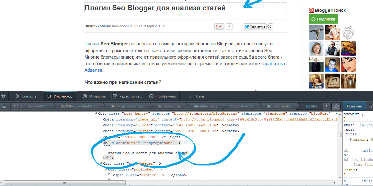 <h2 class="title" itemprop="name">Плагин Seo Blogger для анализа статей</h2>Соответственно, в коде шаблона Blogger мы можем найти заголовок по ближайшим ориентирам: class="title", class="post-header", class="published".
