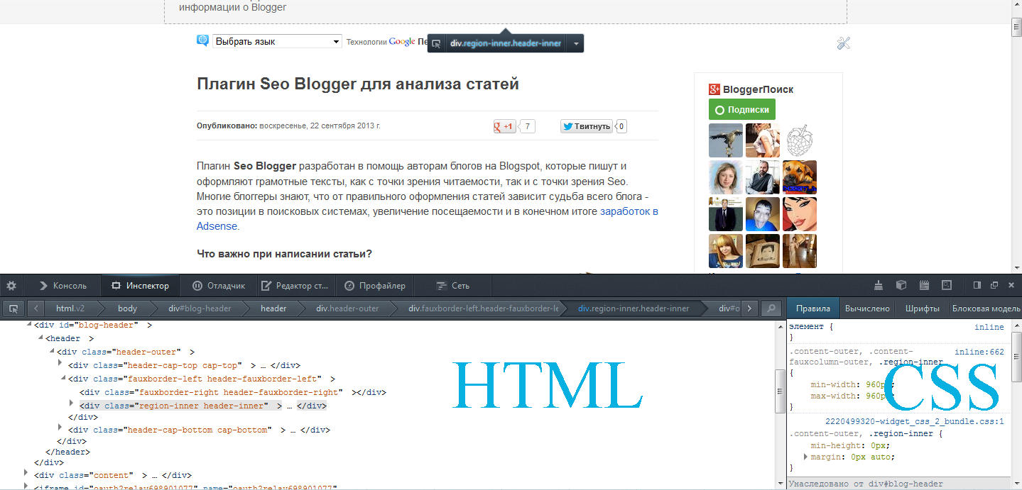 В панели инспектора нас интересует два поля - HTML и CSS. Оба поля активные, их можно редактировать и визуально можно изменить оформление страницы до её перезагрузки. Таким образом уже заранее видно, как будет выглядеть тот или иной элемент на странице.