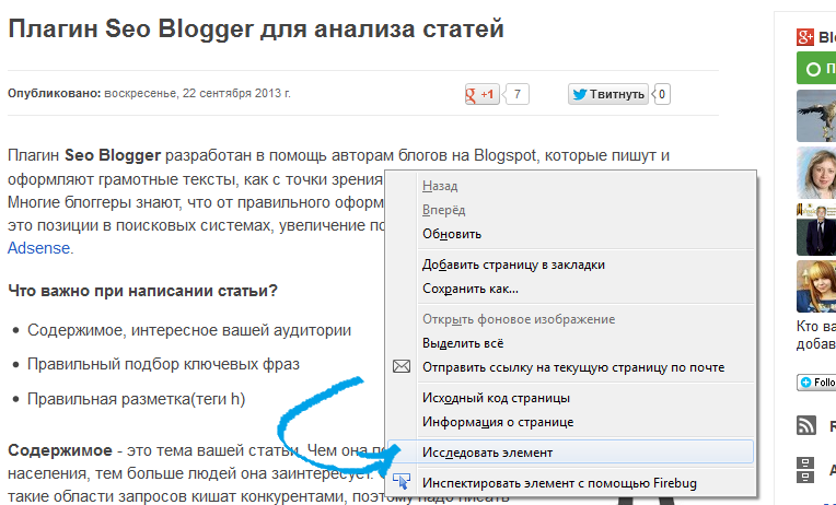 Открываем внутреннюю страницу со статьёй. Нажимаем правой кнопкой мыши на любой части страницы (аналог - горячие клавиши shift-control-i) и выбираем пункт "исследовать элемент" (либо "Инспектировать элемент с помощью Firebug"):