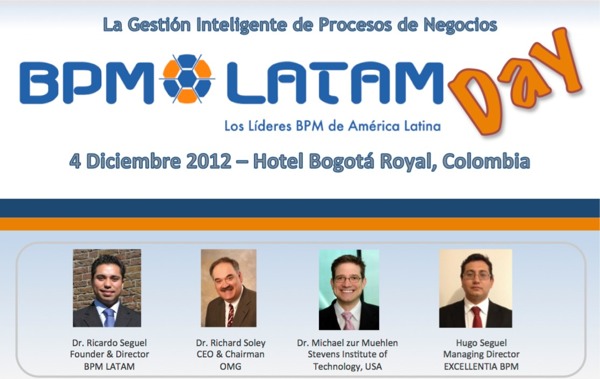 Bogotá, Colombia el 4 de Diciembre con 4 expositores internacionales de renombre que darán las charlas magistrales. Además dentro de 2 de las charlas, tendremos la resolución de casos de aplicación de BPM en Latinoamérica para su desarrollo en grupos. Junto con el evento se ofrecerá también el