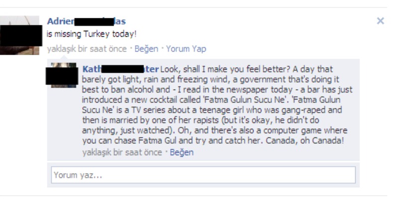 Birkaç hafta önce Kanadalı arkadaşımın Facebook'ta "bugün Türkiye'yi özledim" demesi üzerine diğer Kanadalı'nın yazdığı yorum beni yaşadığımız toplumdan dolayı mahçup hissettirmişti. Paylaşıp paylaşmama konusunda kararsızdım, son günlerdeki gündem!'den dolayı paylaşmaya karar verdim.