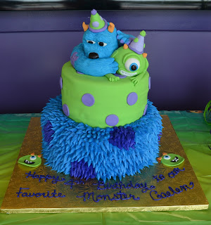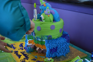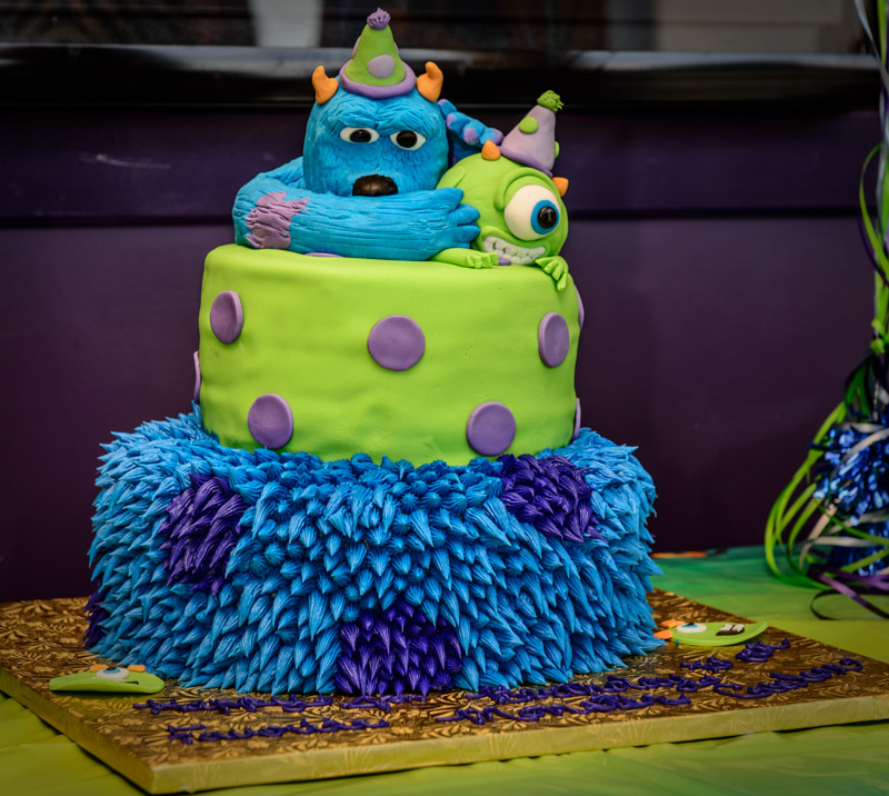 We had his 4th birthday party at the movie theater. He wanted a Monsters birthday party but it wasn't playing anymore, so we invited all of our friends to watch Planes with us, and then have an awesome Monsters birthday cake afterwards. Through the charity Icing Smiles, we were connected with a wonderful local baker named Pam Sargent. She created this beautiful and delicious fantasy cake for Caelen. The inside layers were all different colors and everyone had blue tongues afterwards. I can't thank Icing Smiles and Pam Sargent enough for helping us bring Caelen's request for Monsters to life.