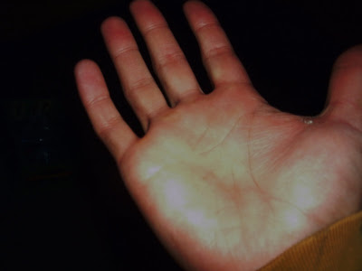 3. It appears that I got a low-level burn from handling bleach. It seems that one of the recycling bins had some discarded bottles of detergent in it. You can see a little white spot on my hand, in between my thumb and first finger. I took this right before I jumped in the shower to clean off: