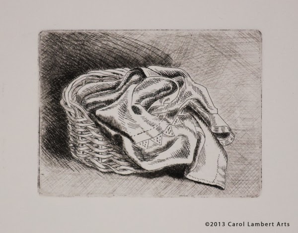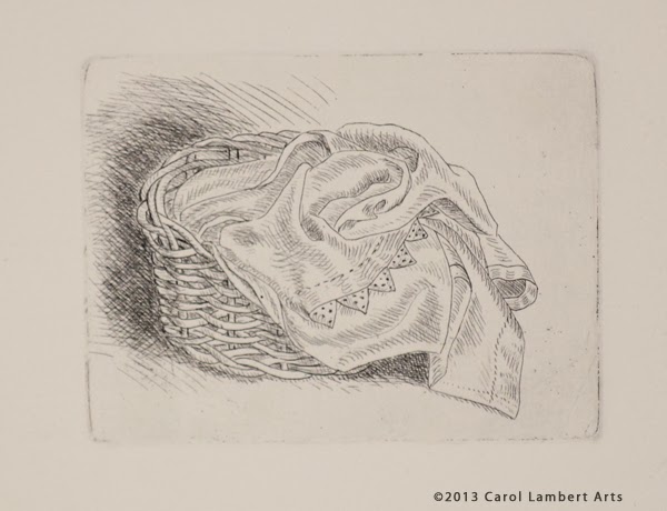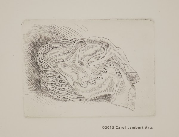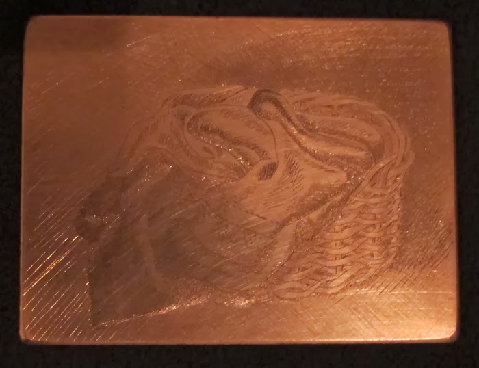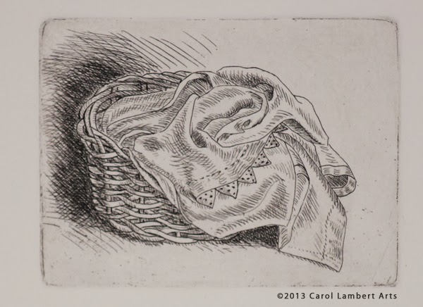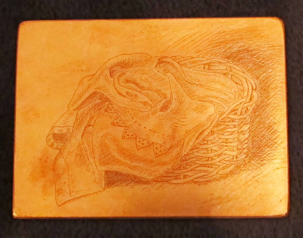 I began to make an etching of a basket, but I didn't like the first state, so I set the plate aside and started over on a new plate. The print is very small, 3 x 4 inches, so I had not lost much effort. Here are some states of the etched basket.
