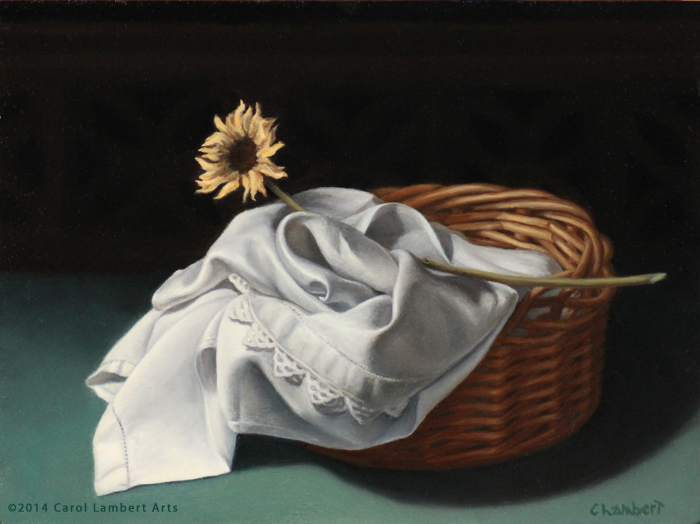 Hard to find such nice baskets! I found one in a yard sale and removed the handle. Then I rummaged in my collection of old linens, and tried, unsuccessfully, to pose the folds with toothpicks. In the end, I arranged the folds without trying to get so close to my inspiration. You may recall this drawing.