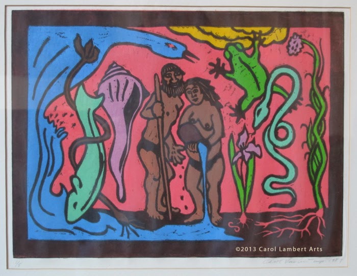 At that same period I experimented with multicolor linoleum block printing, with this result, titled "Eden". (Forgive the reflections on the glass, this one was photographed in its frame.) The dark outline was carved and printed first, then each separate color was inked onto a piece of paperboard and dropped into place for a second trip through the press.