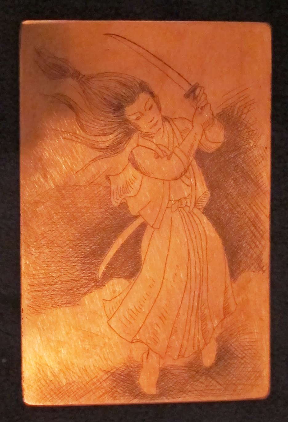 The process of etching involves coating a metal plate with wax, cutting through the wax with tools to make the image, bathing the plate in acid to bite away grooves where the metal is exposed, putting ink into the grooves (or tiny dots, as the gray areas on this plate had) and running it through the press with paper. Voila!