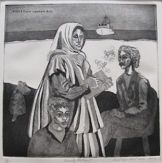Later, I took a class at University of Alaska. This etching titled "Family Portrait" from 1987, commemorates my time living on a boat in Kodiak with my young son, husband, and the dog. If it looks a little grim, well, it was!