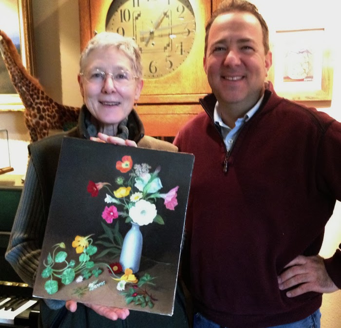 Not 24 hours after posting this painting on the blog, I had inquiries about availability and price. This afternoon I delivered the painting to the new owners, which was very exciting. As you can see by the photo (that's me on the left), they are pleased, too.