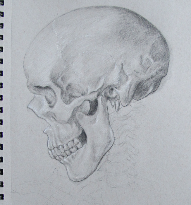 Moving on to a character with a bit more personality, I did my "life" study (another step in our series of exercises) of the head on one of the skeletons at the UAA drawing studio. These are charcoal pencil and white pastel pencil on toned paper.
