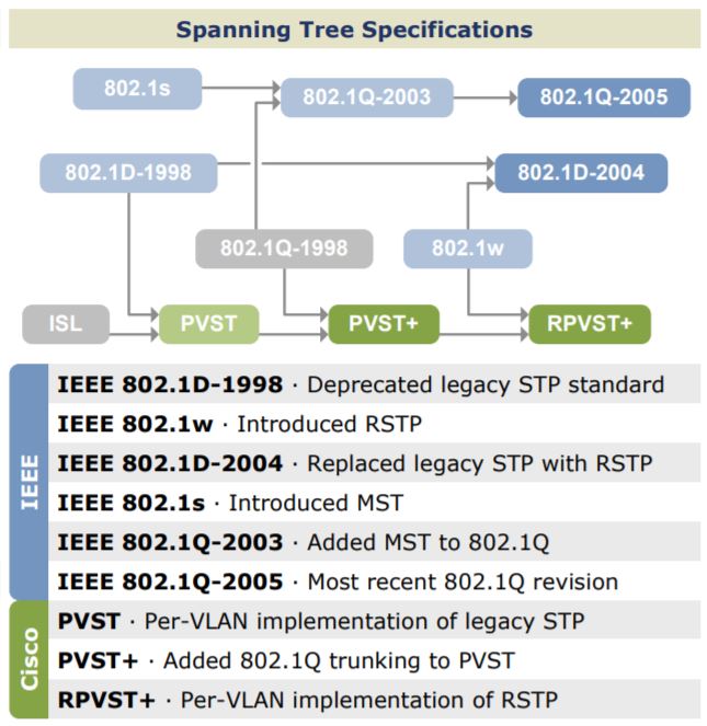 STP: Es la especificación original de STP, definida en 802.1D. STP es algunas veces llamado Spanning Tree común (Common Spanning Tree - CST) debido a que el protocolo asume una instancia de Spanning Tree para toda la red conmutada, independientemente de la cantidad de VLANs.