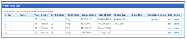9. Senior Citizen passengers already available in the Master list without Aadhaar verification can also be verified by using “Edit” option and submitting complete details including Aadhaar number.