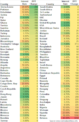 This article reviews the monetary policy interest rate activity of the world's central banks during 2011. The major theme of the year was monetary policy tightening, but the second half of the year featured many banks opting to reverse course or switch to outright net loosening. Indeed of the 87 central banks that Central Bank News monitors, 34 made net increases to their interest rates, while 32 held their rates net unchanged, and 21 made net reductions to their policy interest rates, many of these in the second half of the year (see: Global Interest Rate Movements: Half-Year Review).