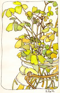 This sketchbook painting was drawn first with fountain pen as a line drawing. I added watercolor using an analogous color scheme of greens and yellows. This is part of the series of morning sketches created using