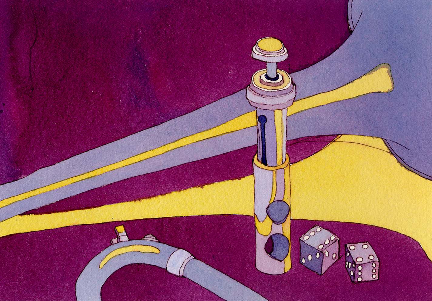 One of a series of 100 drawings and paintings of broken, bent trumpet parts...