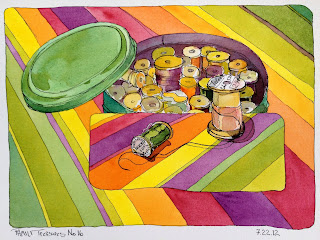 My mother's round, green tin where she stored her wooden spools of thread for mending.