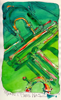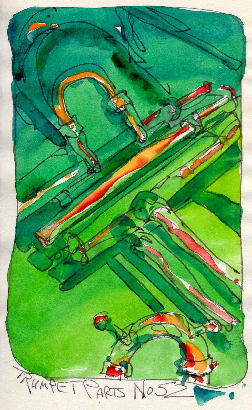 One of a series of 100 drawings and paintings of broken and bent trumpet parts.