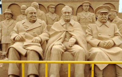 A Russian boy stands near a sand sculpture of (L to R) former British Prime Minister Winston Churchill,