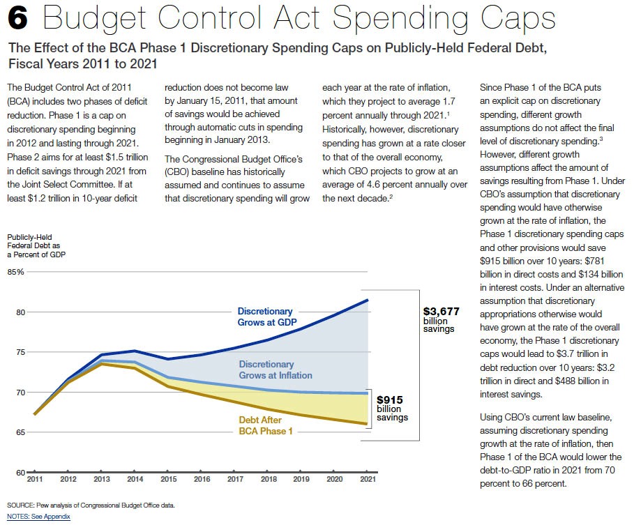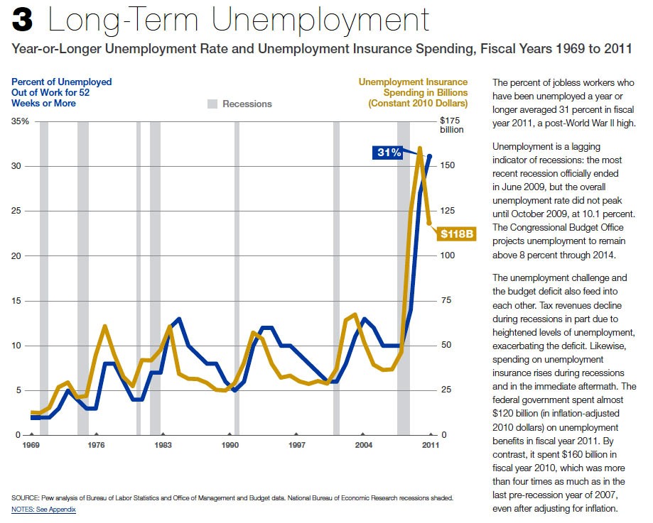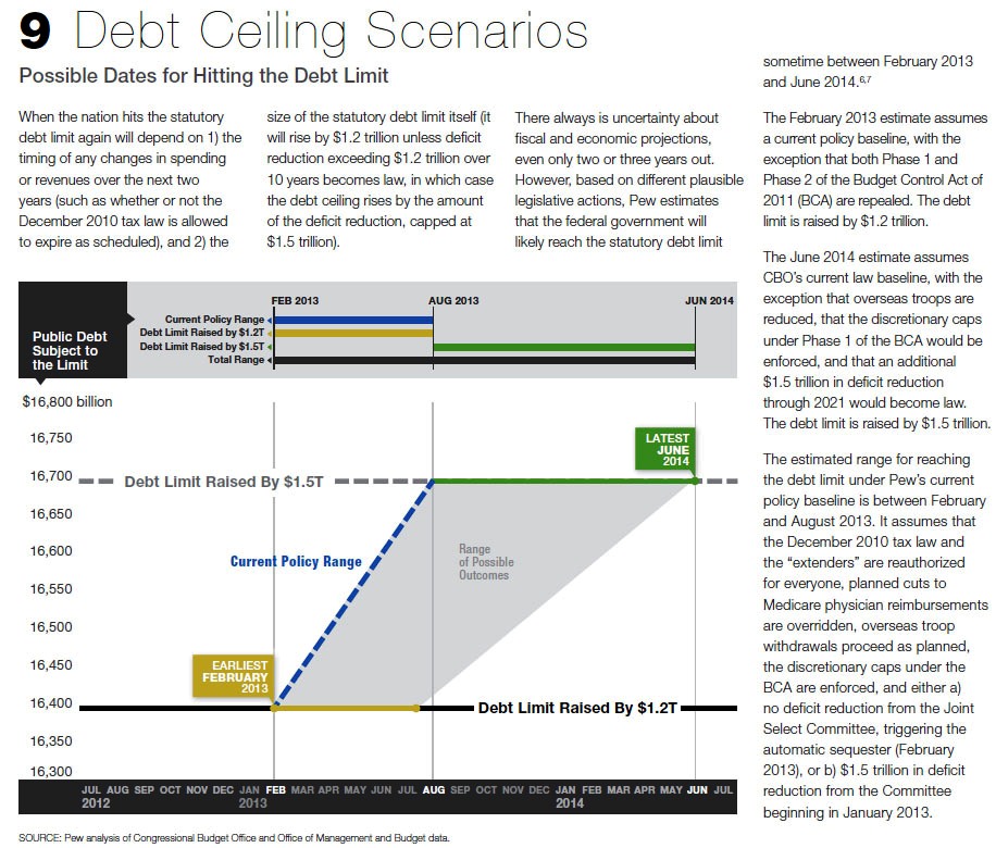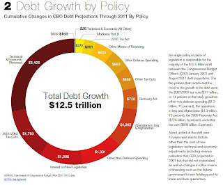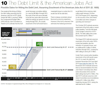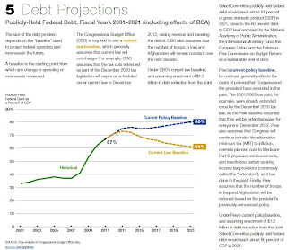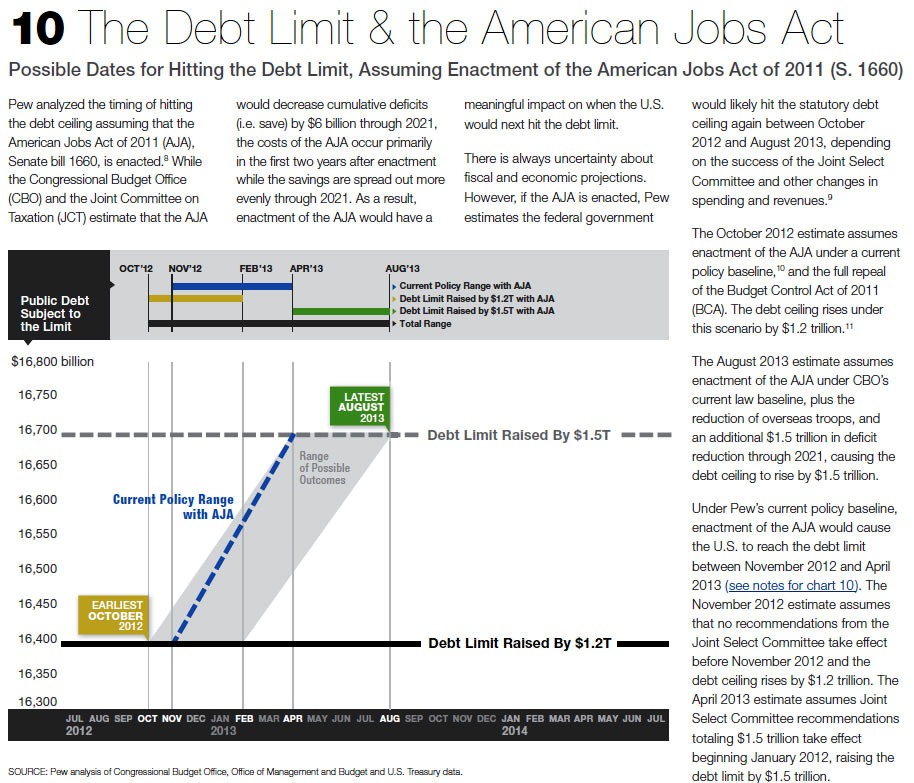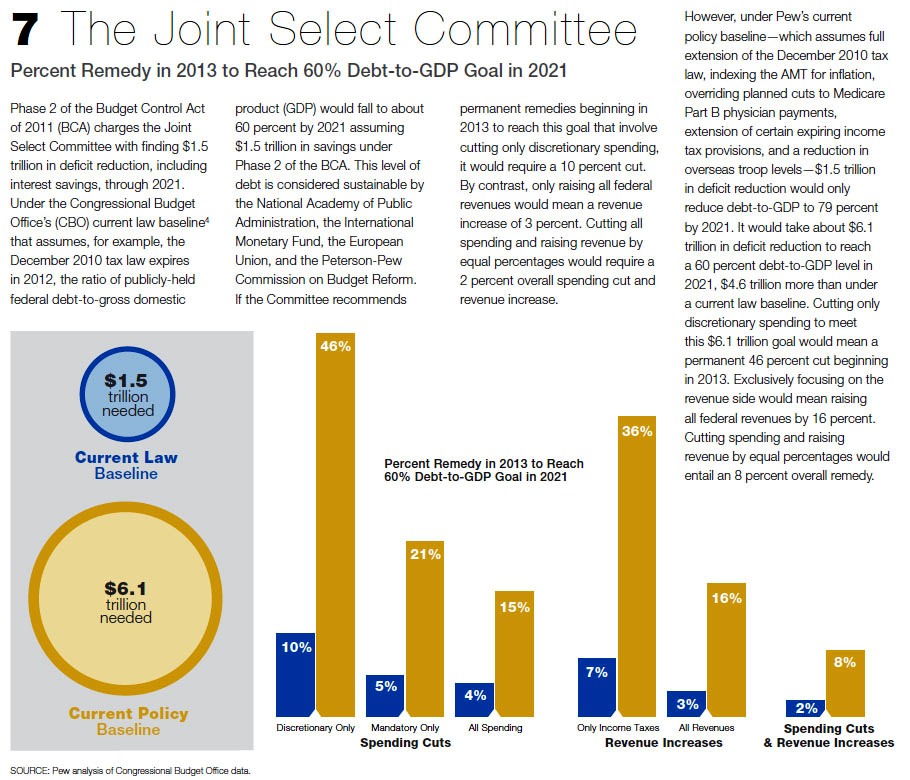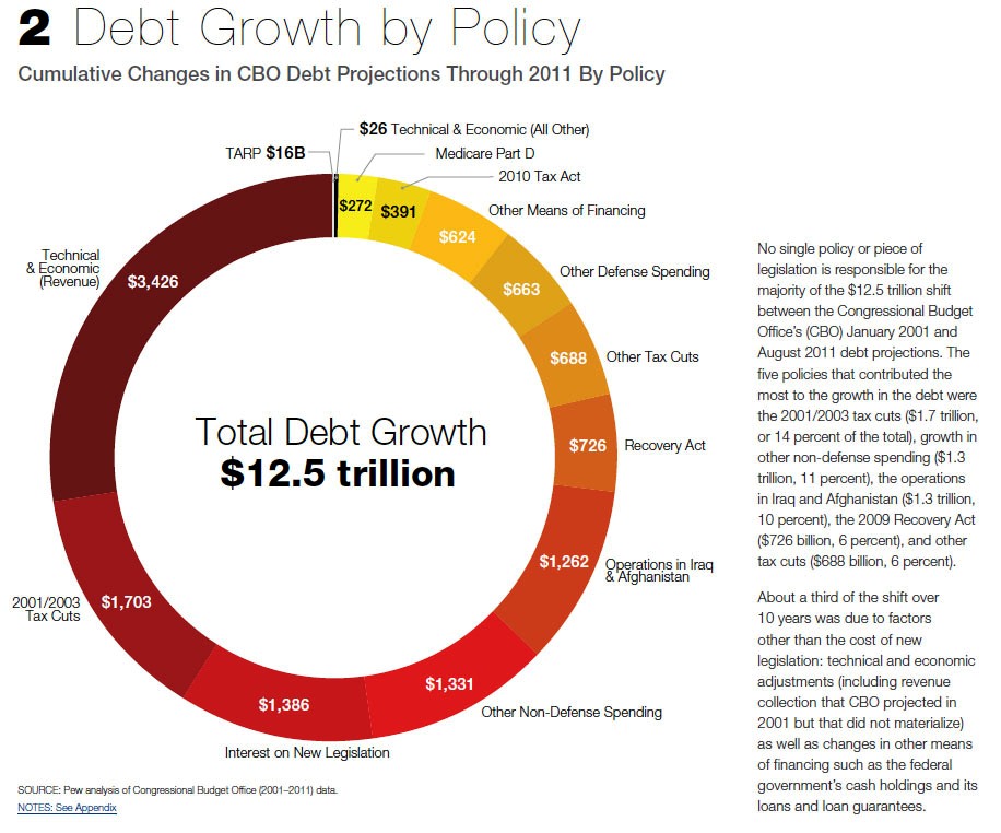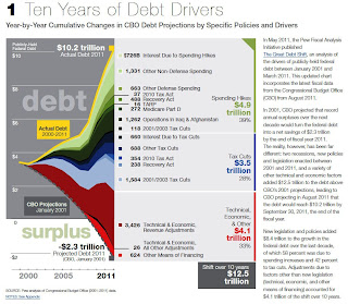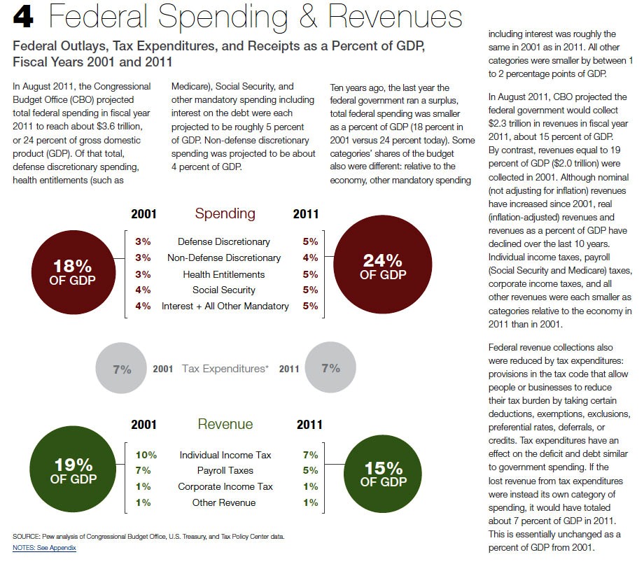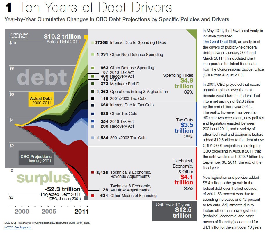 By now nobody should have any doubts as to just how disturbing America's fiscal debacle is. For those naive and innocent few who still think there is a Hollywood ending with a pot of gold awaiting everyone at the end of the rainbow, we present the following "10 essential fiscal charts" from the Pew Policy Institute. To be sure, these are all charts summarizing data that has appeared on Zero Hedge repeatedly over the years in some way shape or form. Pew does, however, have a flair for dramatic visual presentation. In Pew's own words: "Since April 2010, the Pew Fiscal Analysis Initiative has published several reports explaining the medium-and long-term fiscal challenges facing the federal government. With stagnating economic conditions and the passage of new legislation, especially the Budget Control Act of 2011, the outlook for the deficit and debt has changed considerably over the past six months. We have created 10 charts that illustrate how the choices made over the last 10 years contributed to our nation's debt and the challenges currently facing the Joint Select Committee on Deficit Reduction." So without further ado...