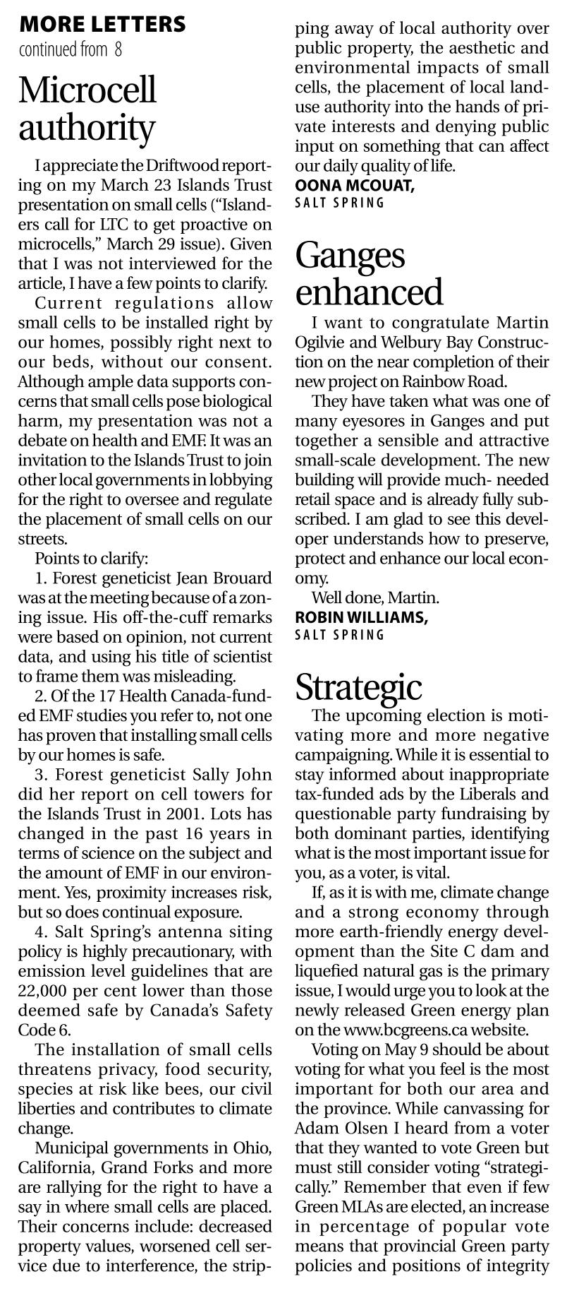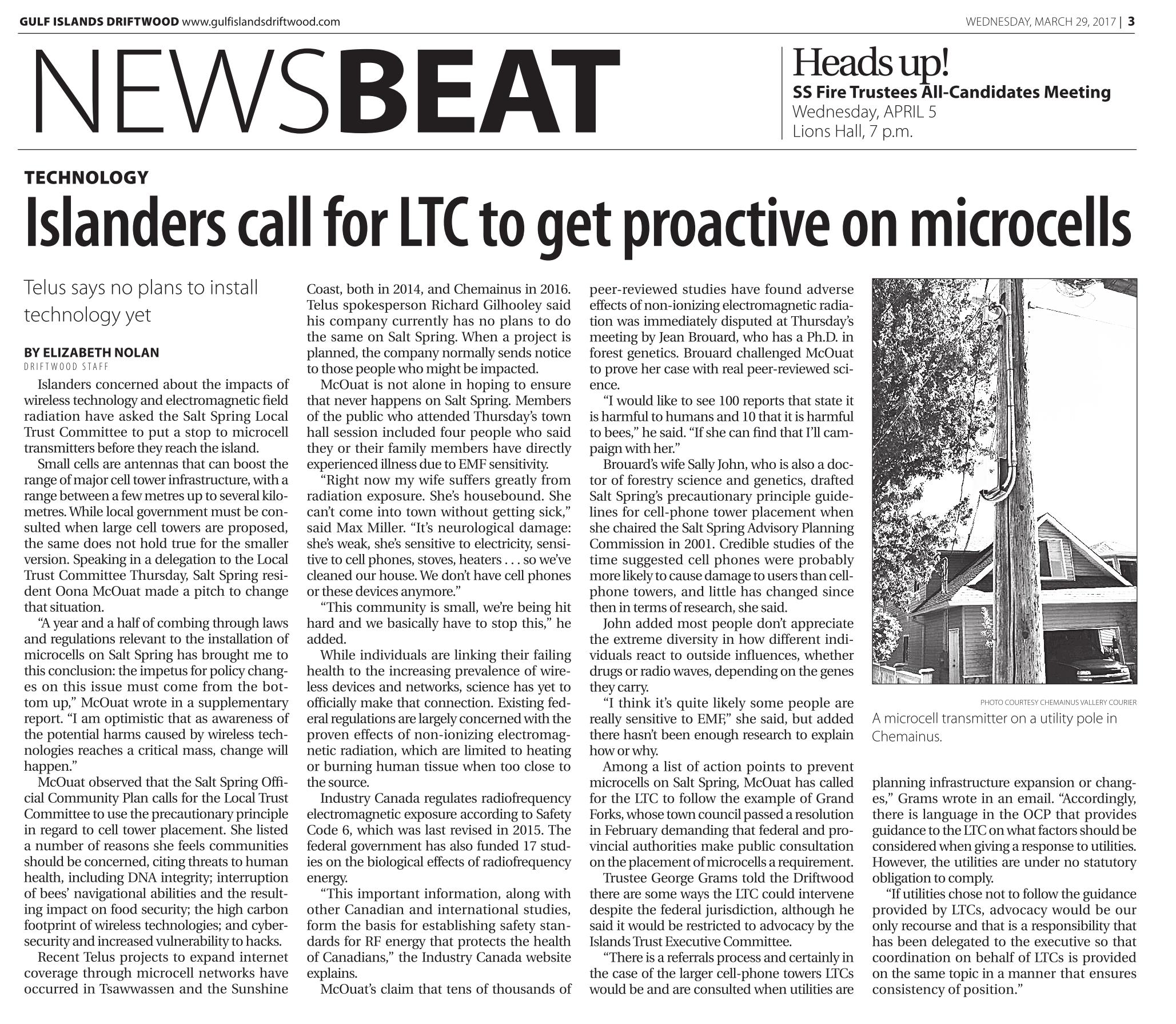4) One of our members gave a wonderful presentation to the Salt Spring Island Trust about the small cells being installed across the province by Telus. Here is the article from the local newspaper and her response.