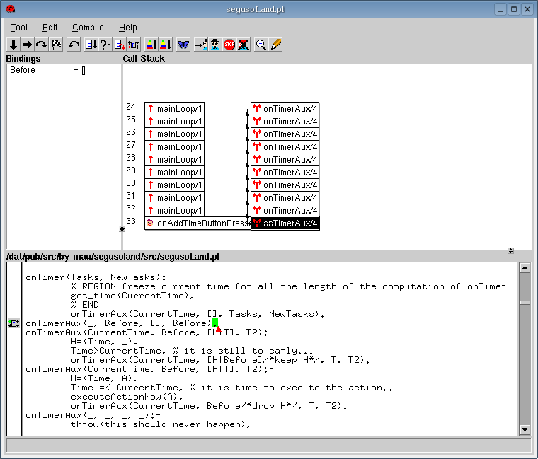 There must be some error in the onTimerAux/4 predicate... but it seems