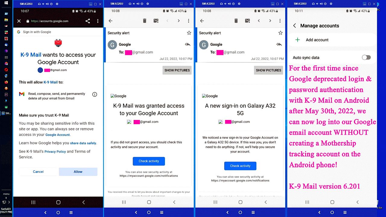 > gmail accounts as you want setup on K9 without having to add them to