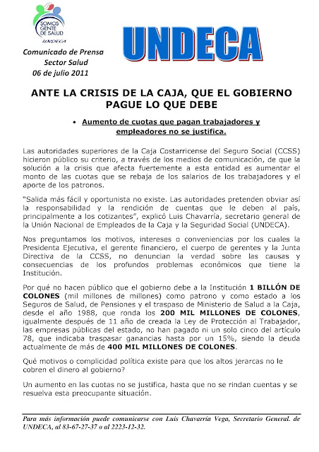 Las autoridades superiores de la Caja Costarricense del Seguro Social (CCSS) hicieron público su criterio, a través de los medios de comunicación, de que la solución a la crisis que afecta fuertemente a esta entidad es aumentar el monto de las cuotas que se rebaja de los salarios de los trabajadores y el aporte de los patronos.