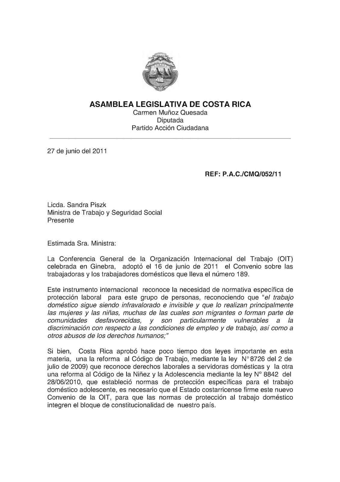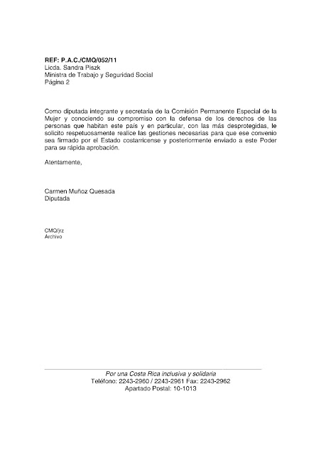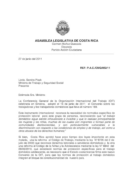 En una nota dirigida a la ministra de Trabajo y Seguridad Social, Sandra Piszk Feinzilber, la diputada Muñoz Quesada solicita al Poder Ejecutivo que las nuevas “normas de protección al trabajo doméstico integren el bloque de constitucionalidad de nuestro país” (Oficio No. P.A.C./CMQ/052/11).