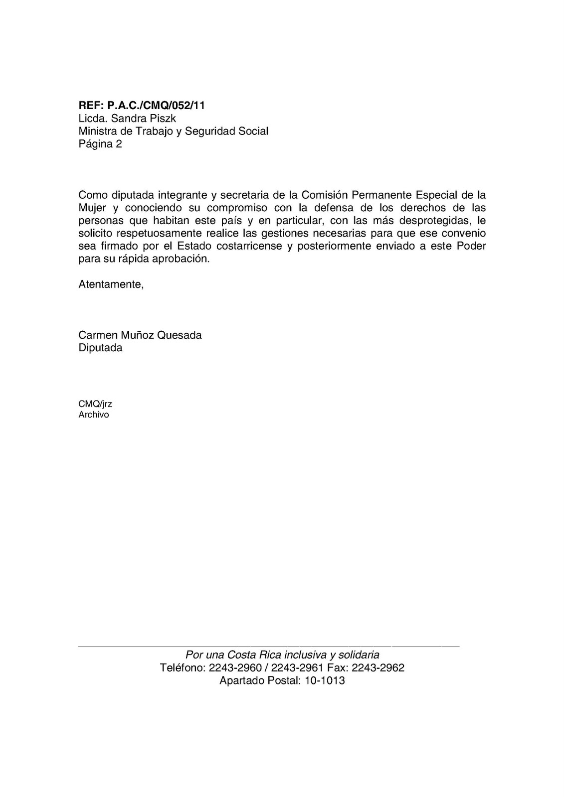 “Conociendo su compromiso con la defensa de los derechos de las personas que habitan este país y en particular, con las más desprotegidas, le solicito respetuosamente realice las gestiones necesarias para que ese convenio sea firmado por el Estado costarricense y posteriormente enviado a este Poder para su rápida aprobación”, señala la misiva.