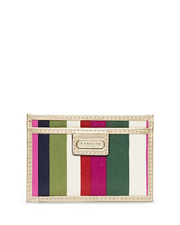 Variegated Legacy Stripes add an artful pop of color to an elegant card case trimmed with gold leather. Ideal for the card-carrying Coach devotee, this practical accessory features an ID window and comes with its own gift box.