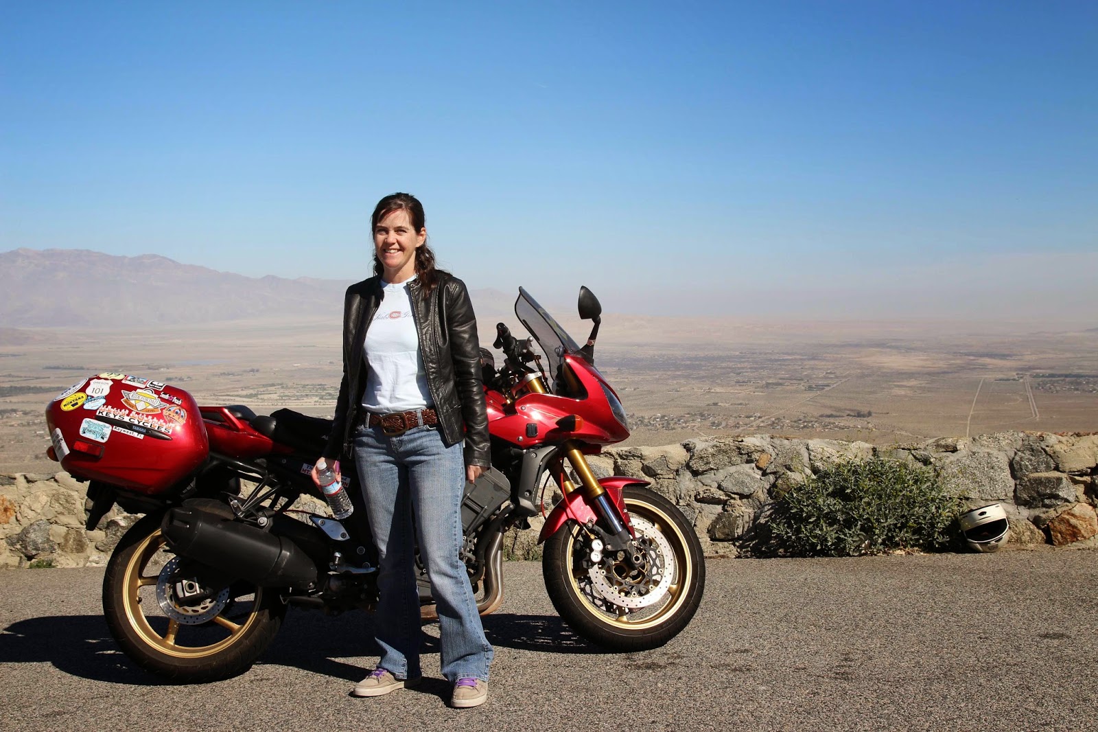 | Beth, my partner in crime, at a lookout on a great section of twisty mountain road with Borrego Springs in the background |