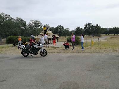 We had just finished running one of the twistiest paved roads that exists in North America, over an hour and a half of non-stop steep climbing and diving corners, rarely getting out of first gear, and when we did it was to only shift right back down again. The Nacamiento Fergusson Road was the only way out of the dead end that the Pacific Coast Highway south through Big Sur had become after a section had been washed out more than a year ago. It was a lot of fun, nerve wracking as hell with no guardrails and many places where there was no room for oncoming traffic, but fun. We were happy to find a place at the end to get off for a well deserved stretch. The pull out even came with a tank.