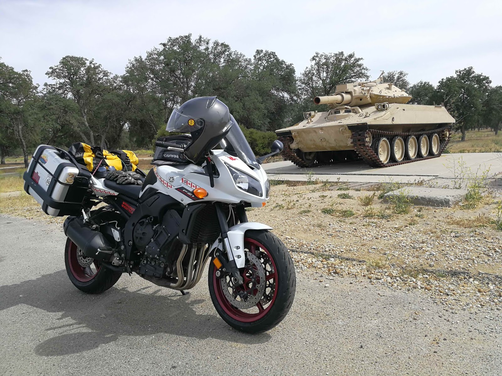 A couple minutes after we had stopped a passenger van filled with Japanese tourists pulled in from the opposite direction, and while most of them made a beeline for the tank and started shooting pictures and selfies like crazy, one came over and made hand motions as if asking if she could take a picture of my bike. I decided to go one better, and indicated that she should pose