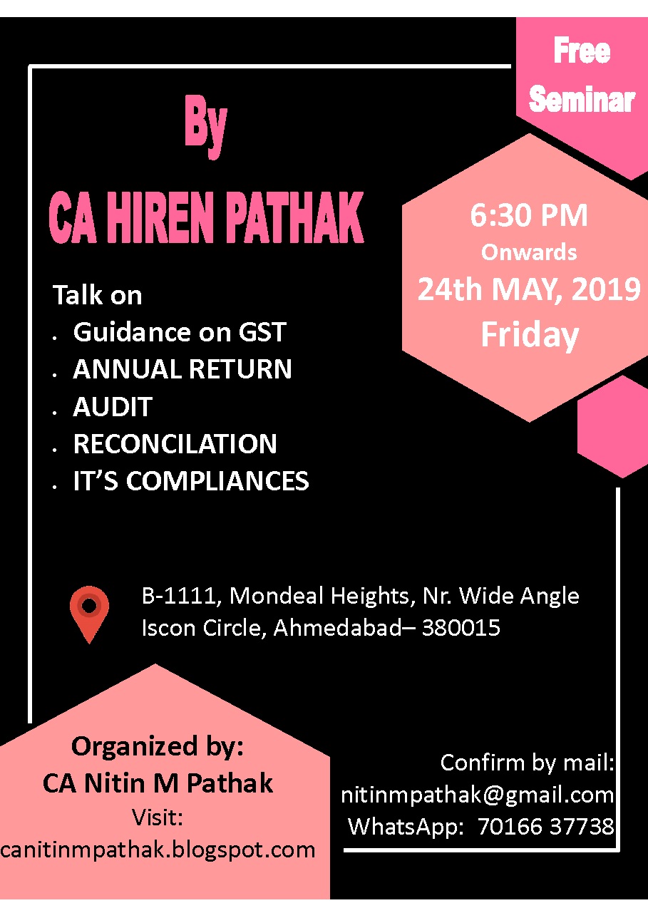 Free S/o 24th May,2019 Friday : GST ANNUAL RETURN, AUDIT AND IT'S COMPLIANCES by CA HIREN PATHAK @6.30PM@B-1111, Mondeal Heights,Ahmedabad: CA NITIN PATHAK
