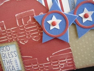 TECHNIQUE: I ran the red cardstock through my Cuttlebug using the Allegro folder, then sanded the paper. I used the same red paper to cut the circles using the Circle Frames Die. I cut the stars out of the velvet paper by hand and layered them with smaller stars, circles and brads.