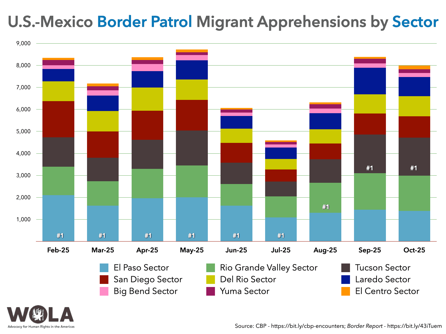 October was the sixth straight month in which CBP did not release a single migrant into the U.S. interior. In the past, most releases were of people seeking asylum in the United States; now, a January 2025 White House proclamation has suspended access to the U.S. asylum system at the border. (This suspension continues to face judicial challenges.) Any migrants allowed to pursue protection at the border, for instance under the Convention Against Torture, appear to be awaiting adjudication while in detention.